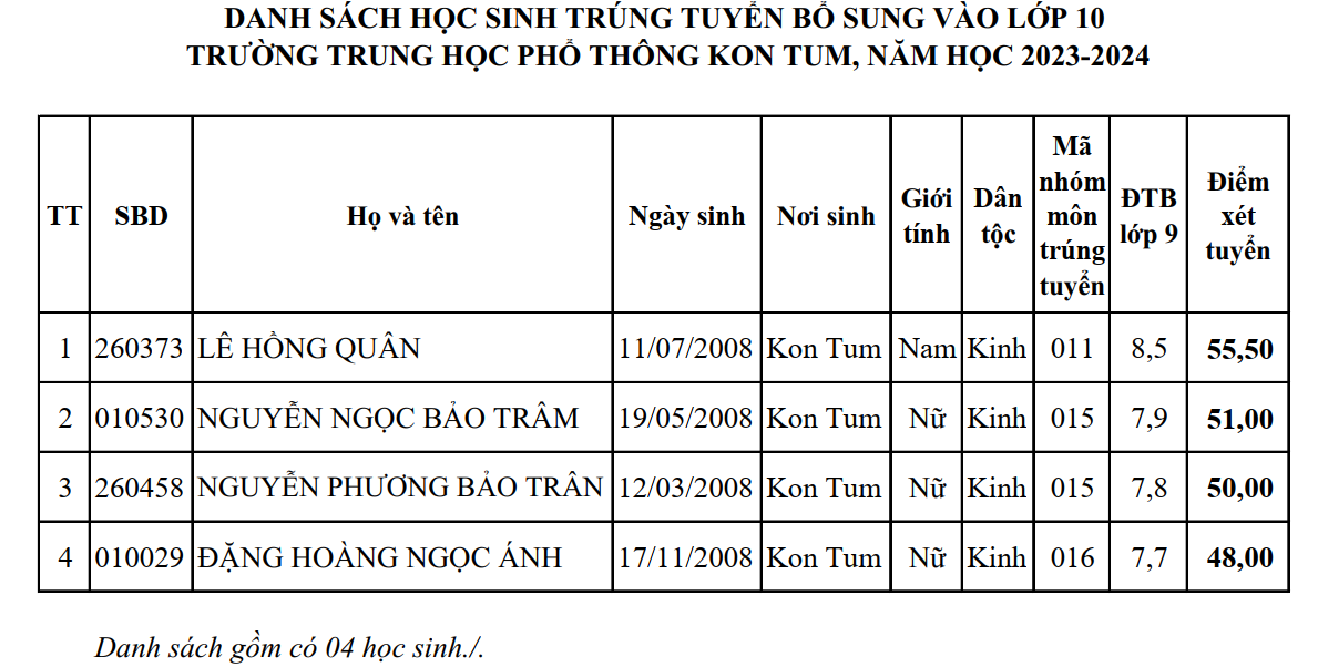 Danh sach học sinh trúng tuyển bổ sung vào lớp 10 Trường Trung học phổ thông Kon Tum, năm học 2023-2024